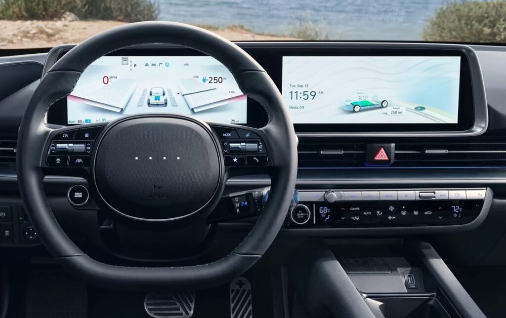 Inside, the Ioniq 6 feels modern, quiet, and tech-driven. Two massive 12.3-inch digital displays create a futuristic cockpit experience, with Android Auto, Apple CarPlay, and navigation standard across trims.